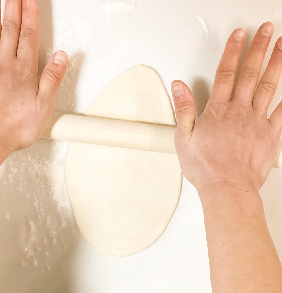 生地を伸ばす際、生地が綿棒につき扱いにくければ、適宜打ち粉をして下さい。