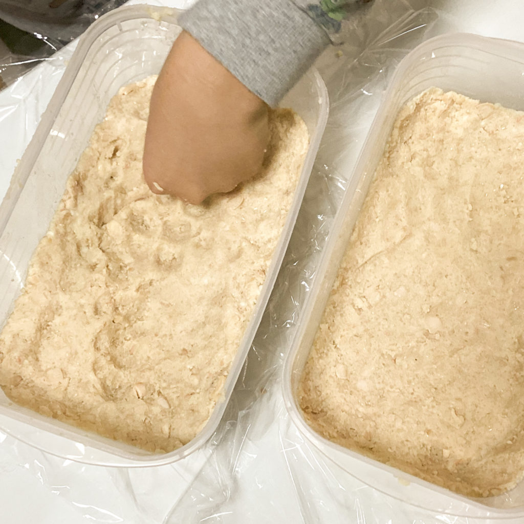密閉容器ではない場合は、表面に発生する白カビ状の酵母菌の発生を抑えるため、重石をのせて終了です。