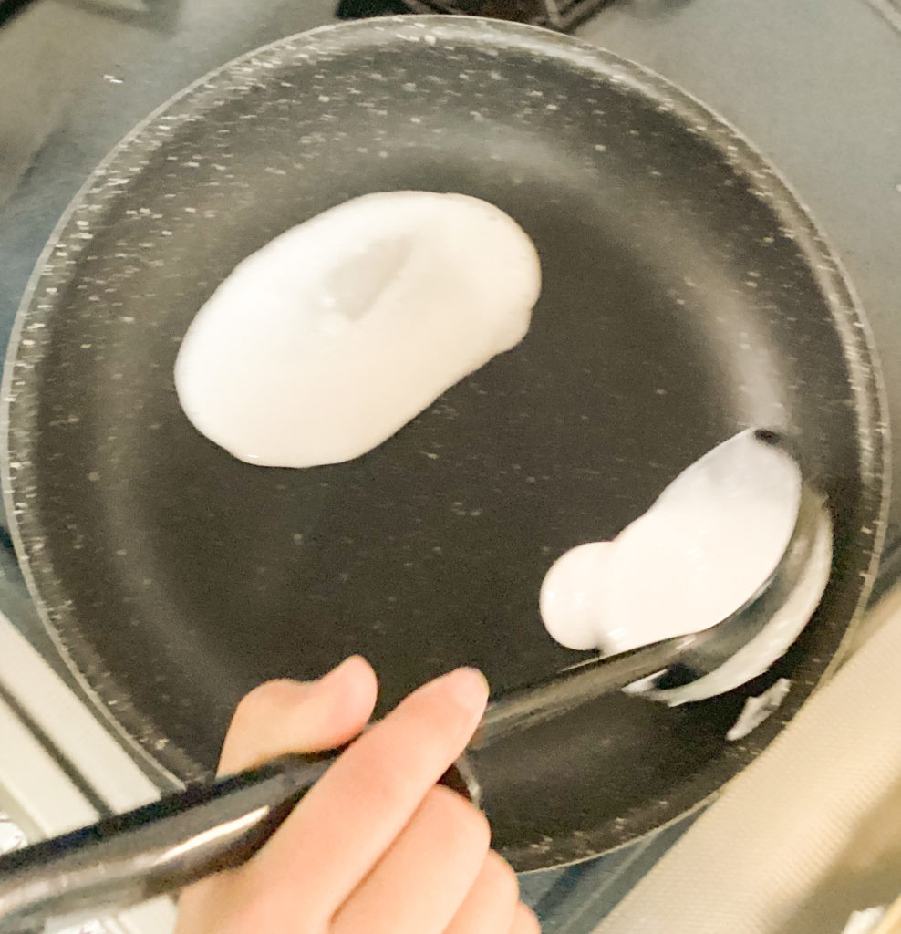 <5>フライパンを熱し、6cm×13cmくらいの楕円形に