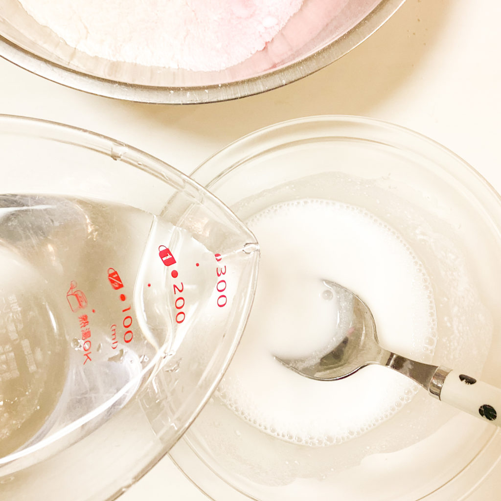 ピンク色にするのに、食紅で色をつけていますが、