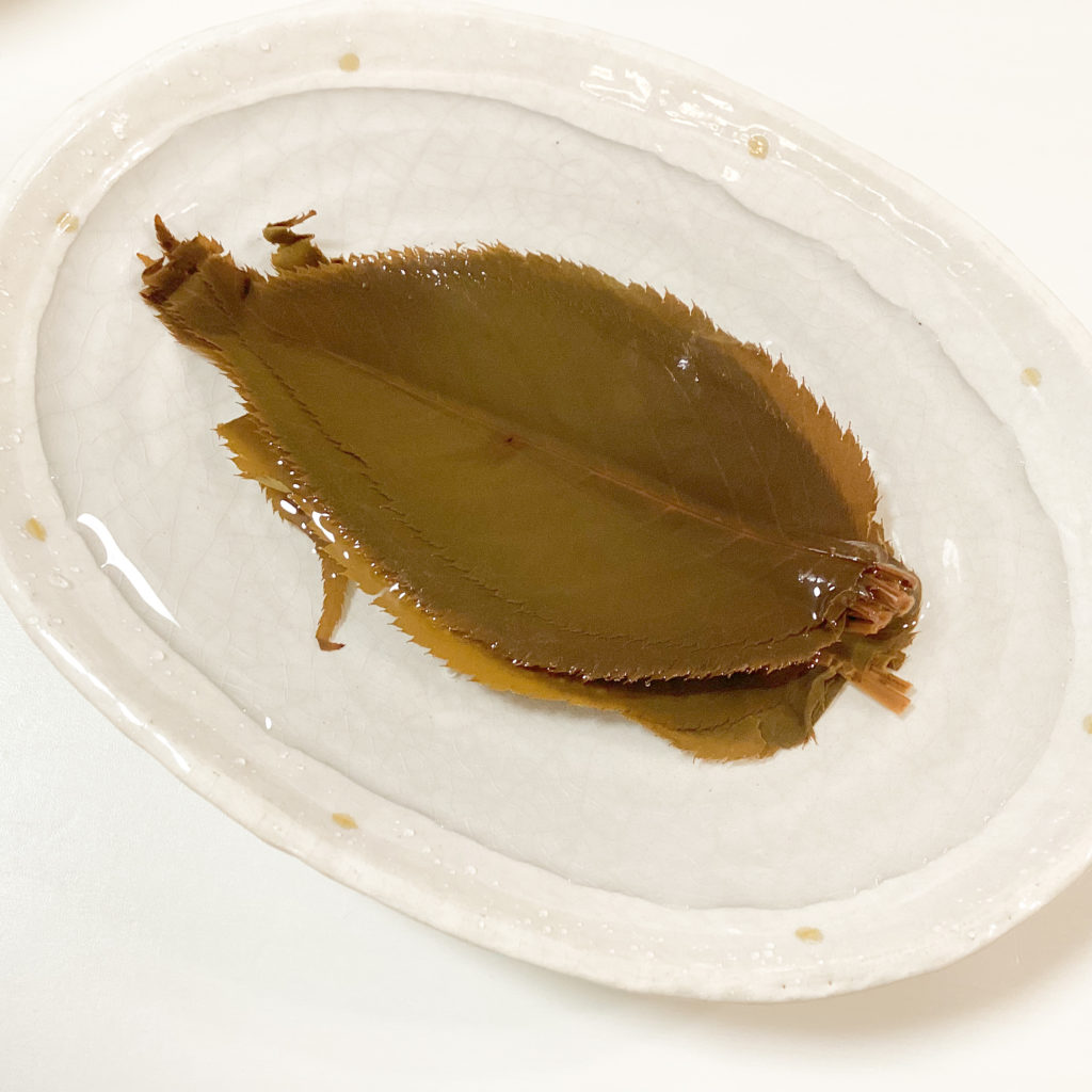 <1>桜の葉は水に浸し、塩抜きする。