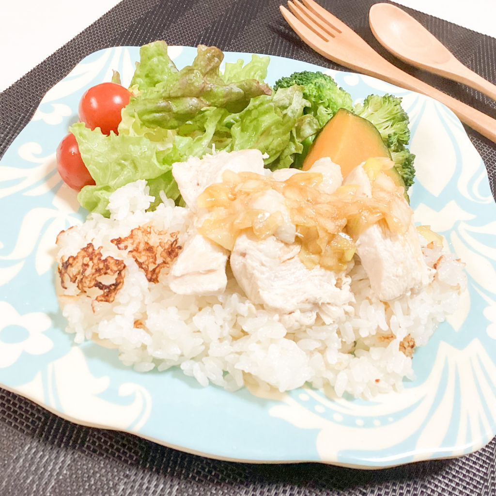 5)ご飯は塩コショウで味を整え、鶏肉は食べやすい大きさにし、4をお好みでかける。