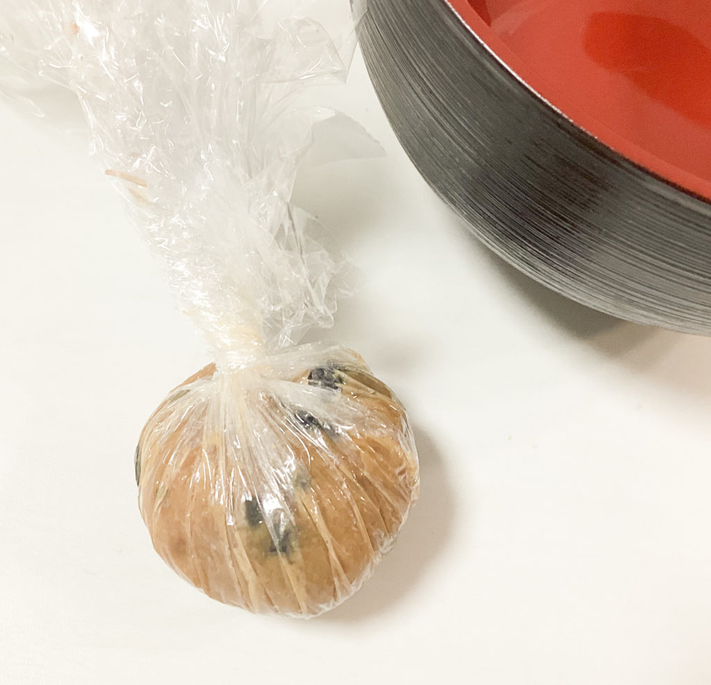 ラップにみそ、かつお節、お好みの具材を入れ、丸く包んでみそ玉の出来上がりです。