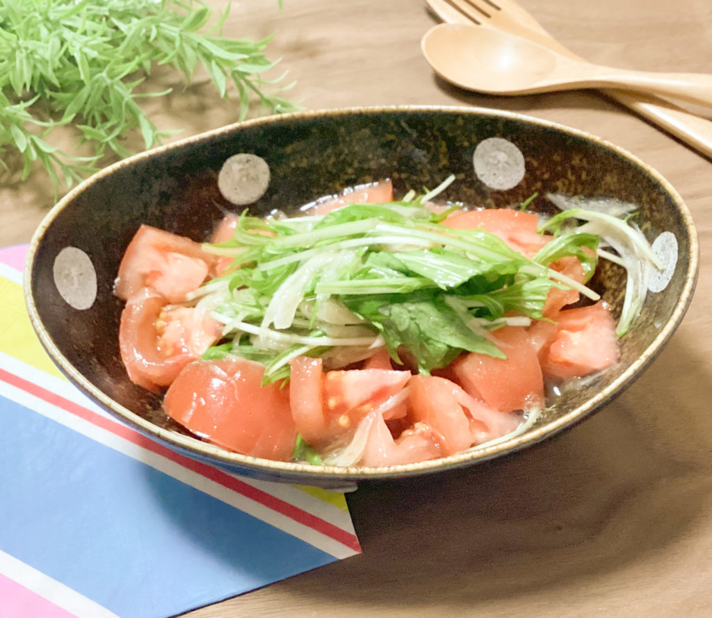 4)トマトを先に盛り付けるようにし、上から玉ねぎ水菜がのるように盛り付ける。