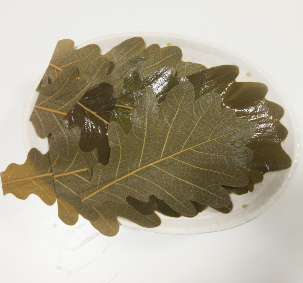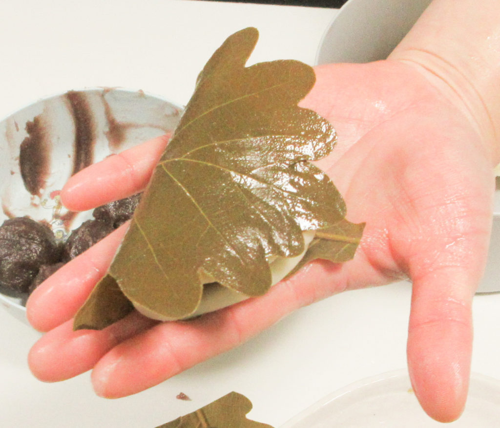 <1>柏の葉は塩漬けのものであれば、軽く洗って、水分はキッチンペーパーで取っておく。