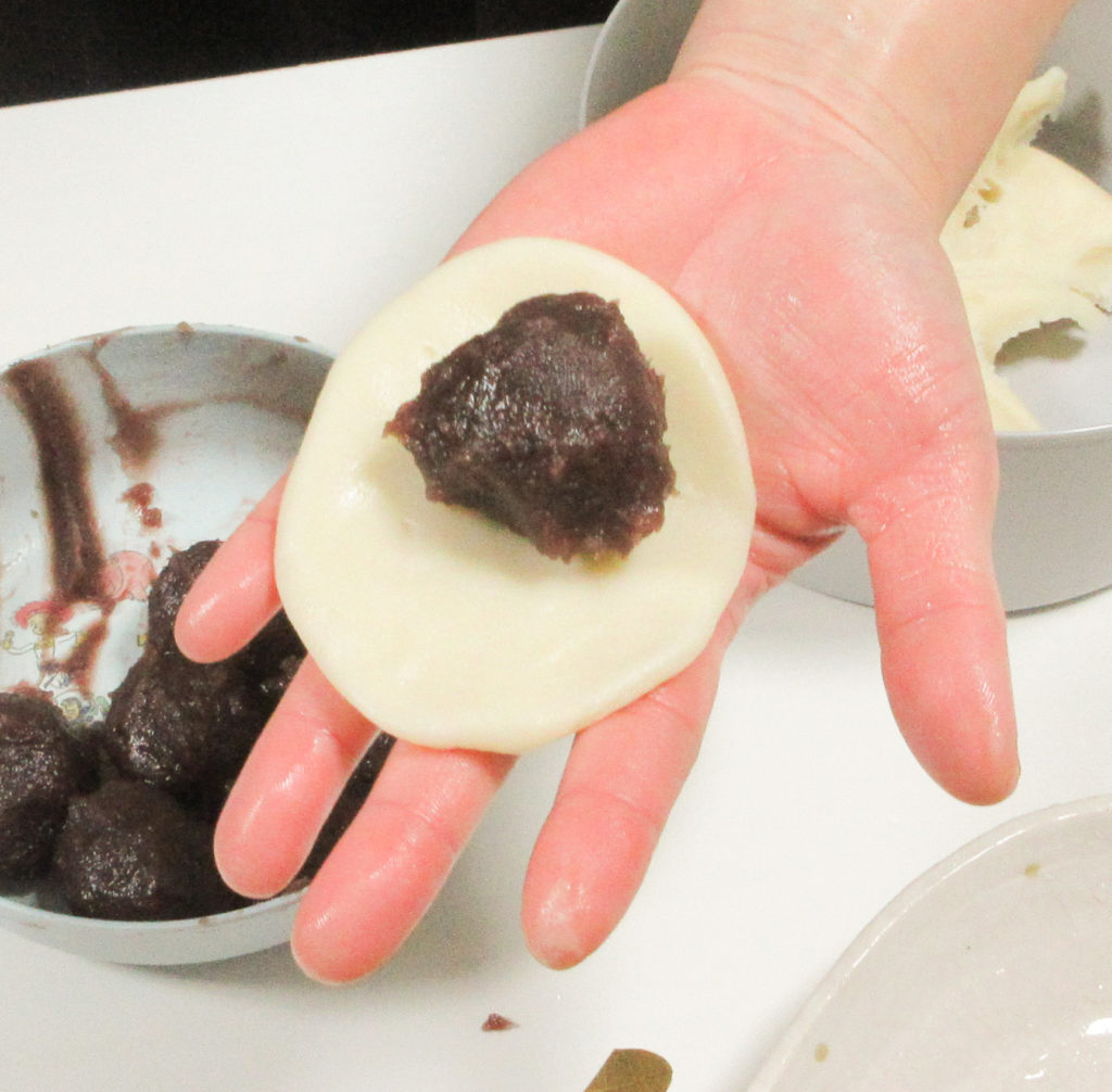 <7>生地を丸めてから円形に伸ばし、8等分にしておいたあんこをのせる。