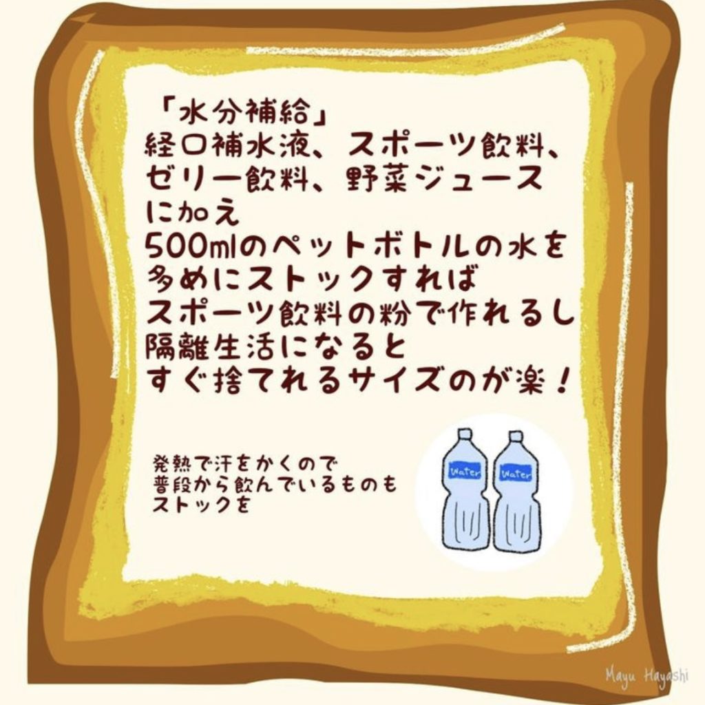 水はもちろんのこと、スポーツ飲料やゼリー、野菜ジュースなどもストックしておくといいです。