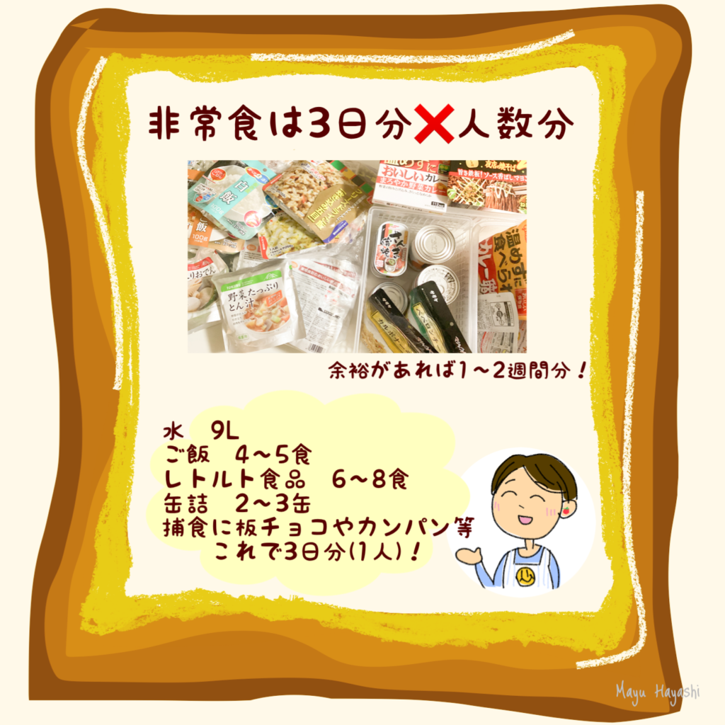非常食として、3日分を人数分、余裕があれば1〜2週間分