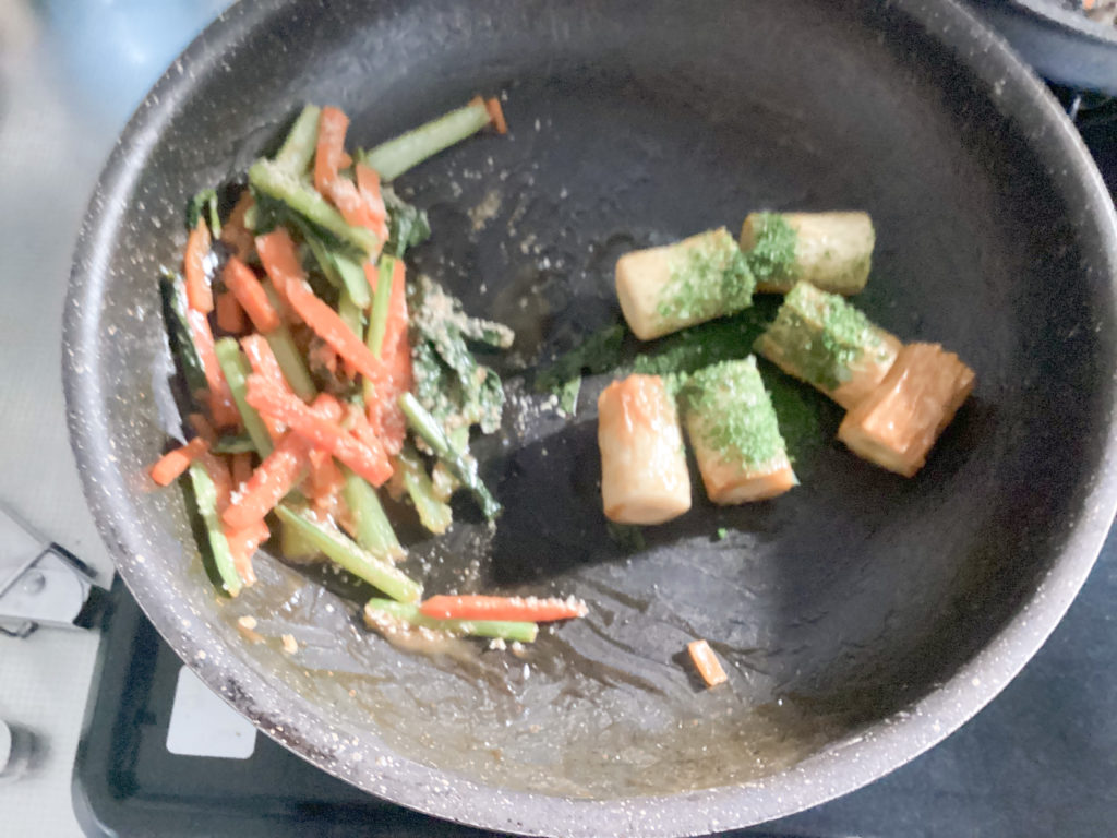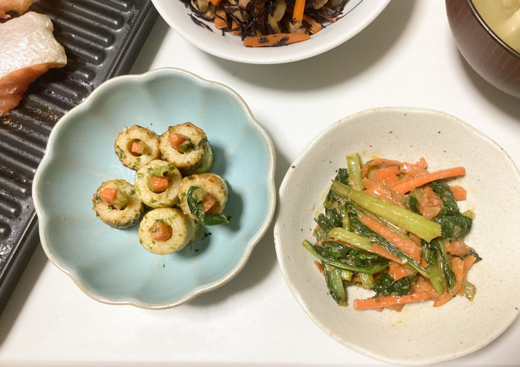 3)ちくわには青のり、人参と青菜にはすりごまを加え変化をつける(お好みで工夫しましょう)