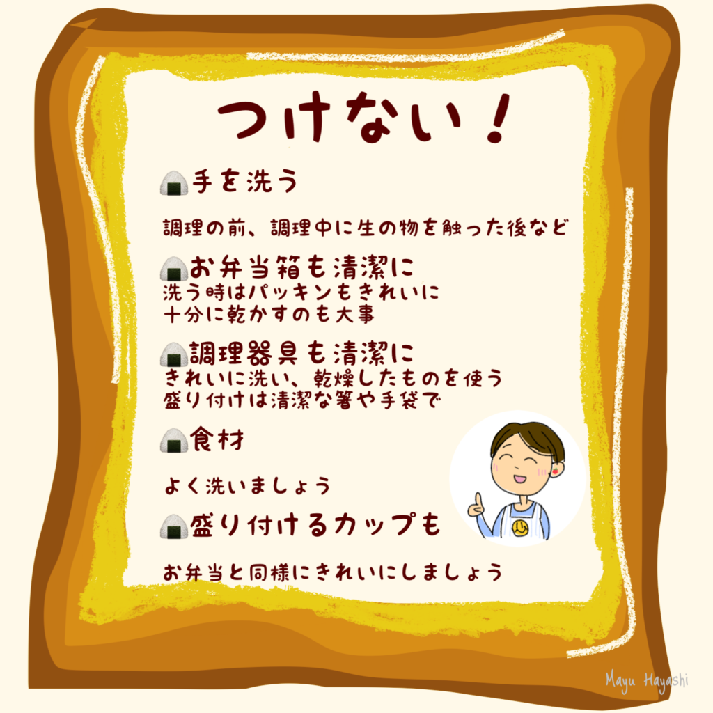 食べる前には手を洗い、お弁当の味や匂いがおかしい場合は食べないようにしましょう。
