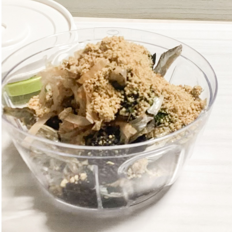 あえてブンブンチョッパーで子どもとミネラルふりかけ作りをしました。