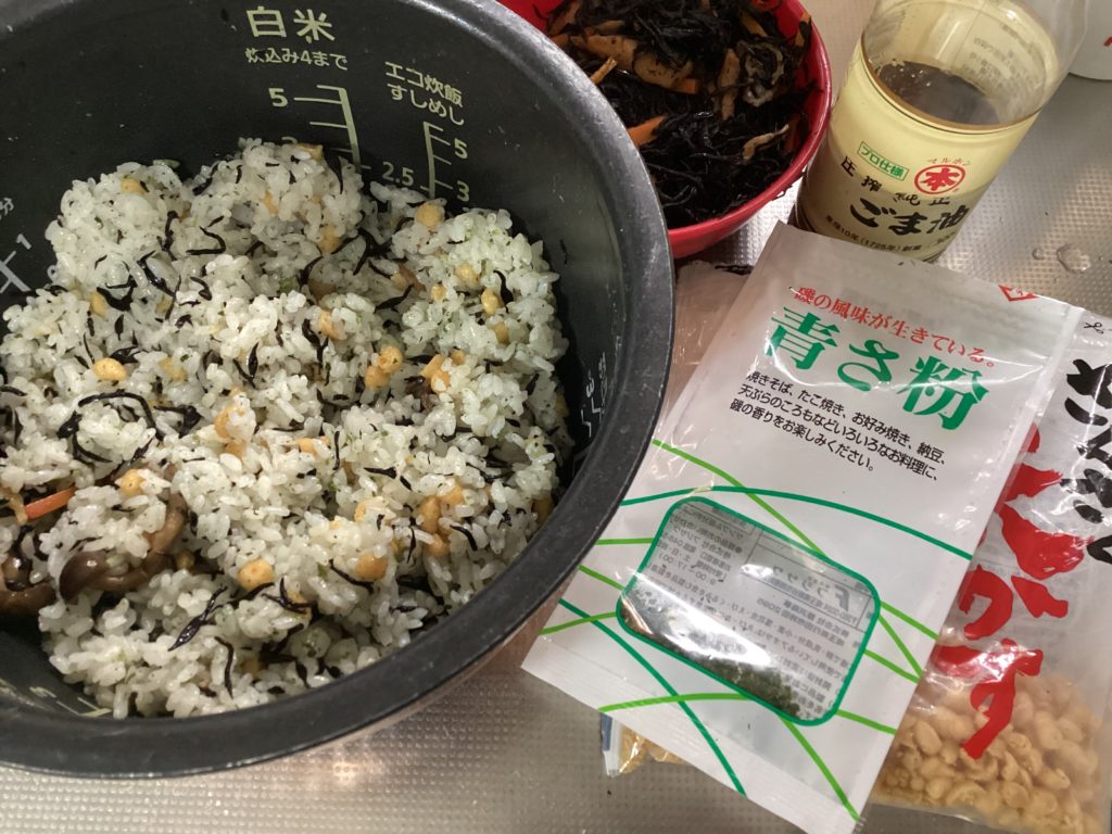ひじきの煮物と揚げ玉、ごま油、青のりであのおにぎりみたいになり、