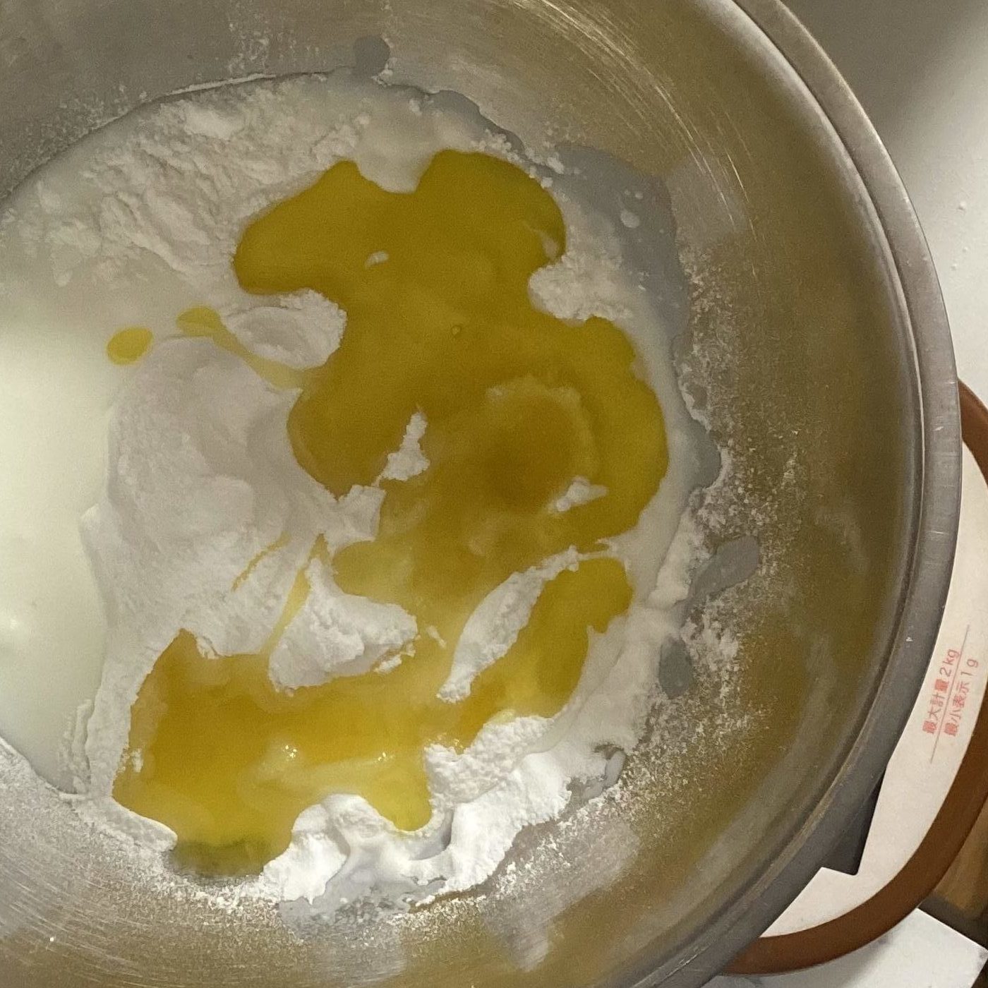 <1>米粉、油、牛乳をボウルに入れ、混ぜる。