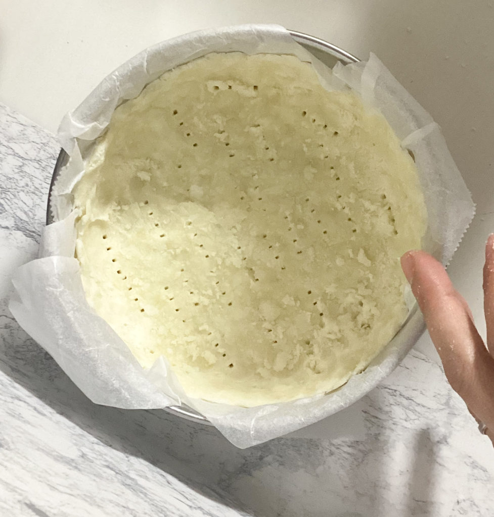 <4>型に押しつけながら生地を詰め、フォークで穴を開け、オーブンで190℃15分焼く。